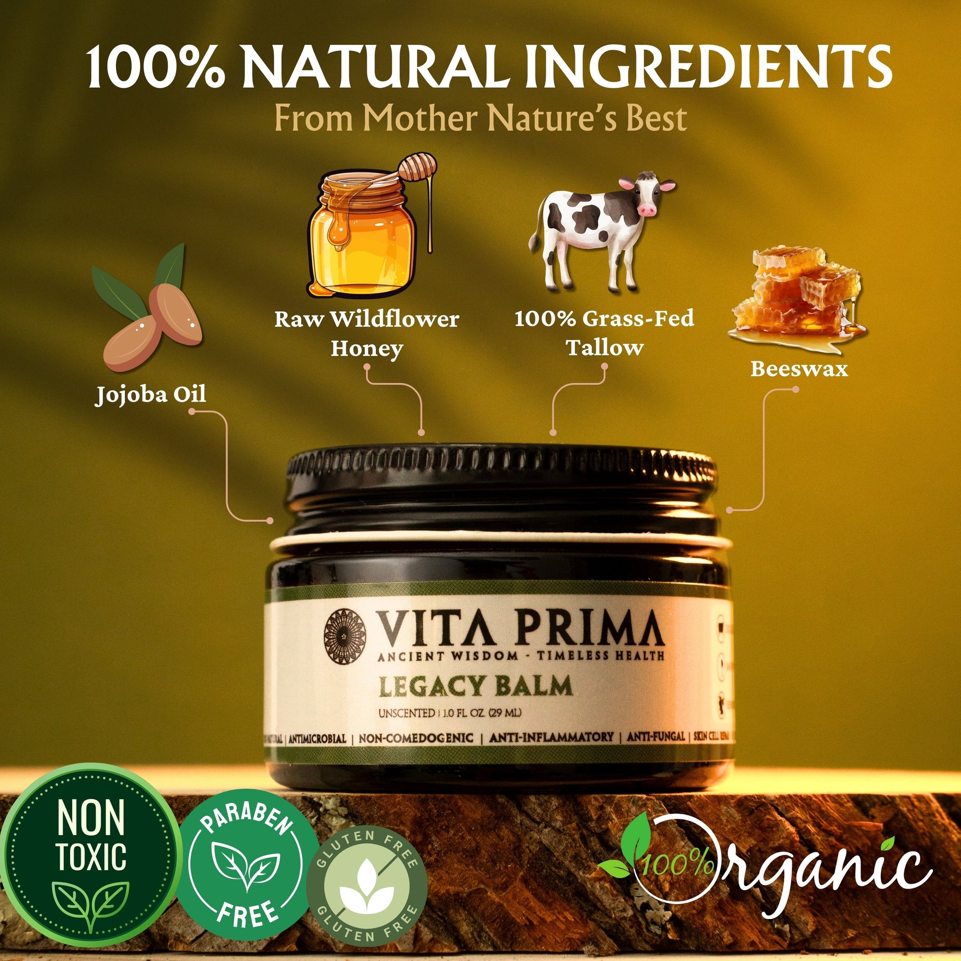 Revitalize your skin with our Legacy Tallow Balm, lovingly crafted from 100% Grass-Fed Grass-Finished Tallow, Organic Raw Wildflower Honey, and Organic Jojoba Oil. Formulated to target dryness, eczema, acne, and other skin concerns, our potent anti-inflammatory balm works to heal and rejuvenate your skin from within.