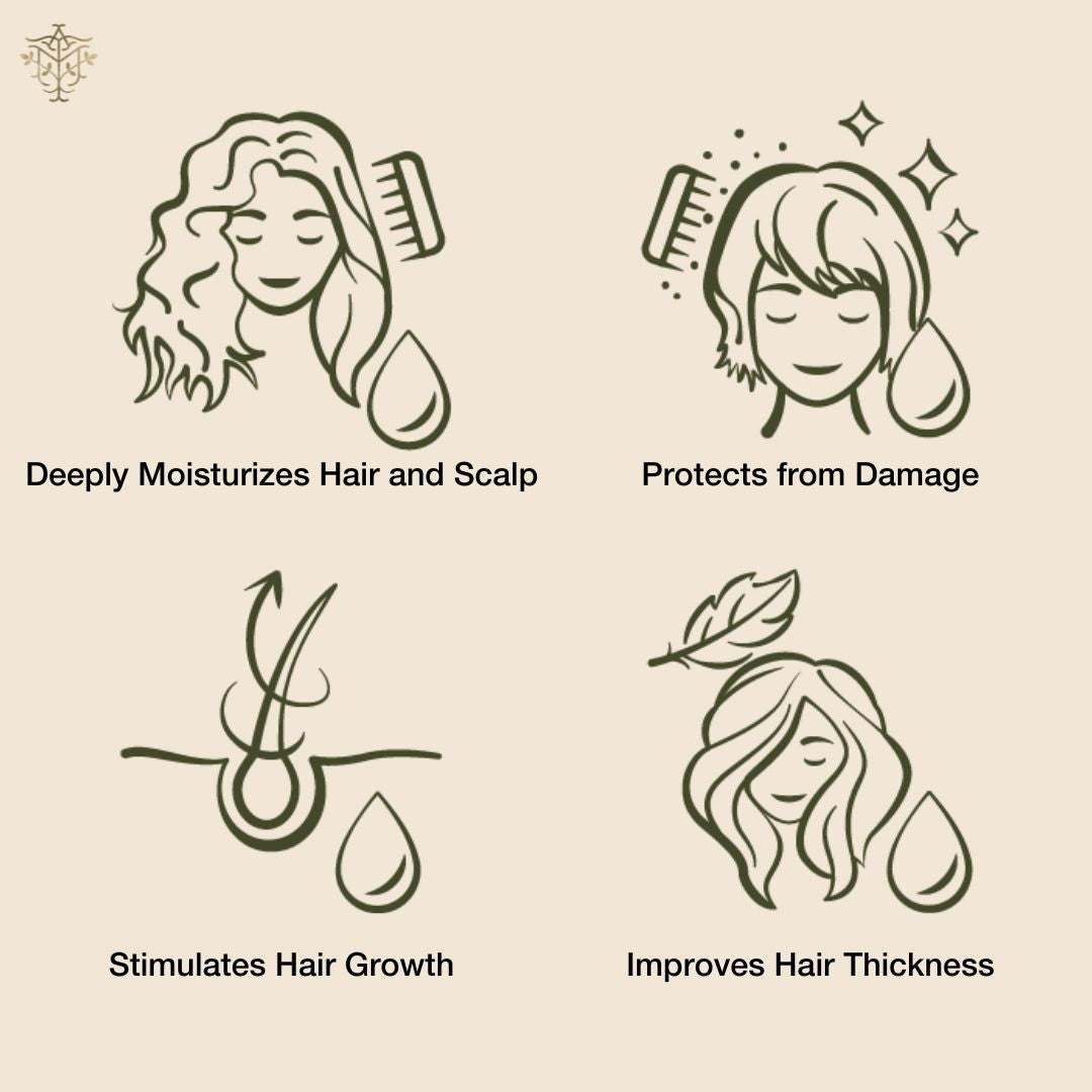 Promotes Hair Growth: Rich in essential fatty acids and vitamins, our hair treatment stimulates hair follicles, promoting stronger, thicker hair growth. Embrace fuller, more voluminous locks with regular use.